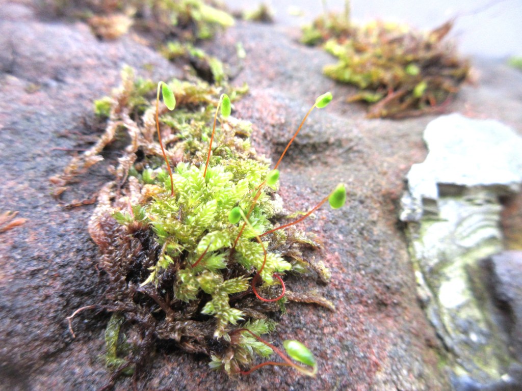 Moss blooms. Well, okay. According to the experts—it doesn’t bloom. It reproduces through spores. But it puts up shoots that look like blooms. I love to bend down and study moss intently when it “blooms.” I imagine a world invisible to us, peopled by tiny organisms that go about everyday life on their patch of moss tending the blooms that are like trees to them, building a secret life under our very eyes, a life that is impossible for us to see.